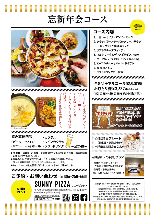 ヒロムサンライズ初の「カスタマイズピッツァ」専門店です。お好みの具材をトッピングして焼き上げれば、あなただけのアツアツオリジナルピッツァの完成です。もちろん、ピッツァは食べ放題!ディナータイムは大人数でのパーティーも可能です。貸切(50名〜100名)もOK!食べ方いろいろ、みんなでシェアして盛り上がろう!