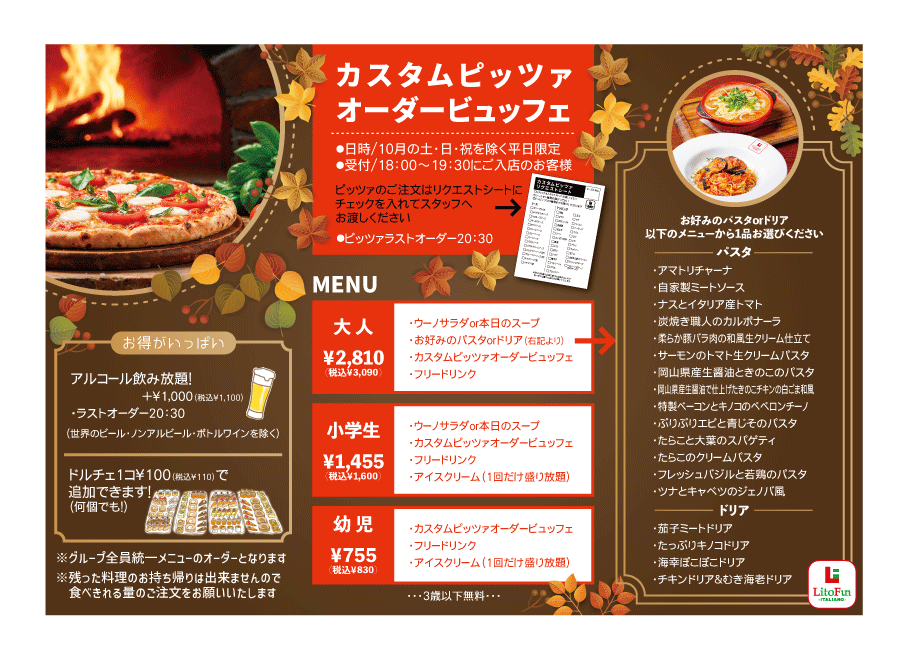 ヒロムサンライズ初の「カスタマイズピッツァ」専門店です。お好みの具材をトッピングして焼き上げれば、あなただけのアツアツオリジナルピッツァの完成です。もちろん、ピッツァは食べ放題!ディナータイムは大人数でのパーティーも可能です。貸切(50名〜100名)もOK!食べ方いろいろ、みんなでシェアして盛り上がろう!