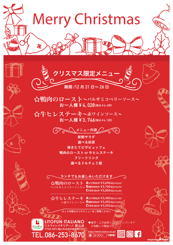Christmas MENU 2025 11/06 岡山店 2025-11-06 岡山店 よかったらシェアしてね! URLをコピーしました! URLをコピーしました! 忘新年会プランのご案内 関連記事 TAKE OUT MENU 2025-09-19 秋のおすすめLUNCH PASTA 2025-09-03 おすすめPIZZA 2025-09-03 ごほうび♪ランチハンバーグ 2025-08-01 プチ贅沢ディナー 2025-08-01 岡山店&倉敷店♥おすすめPIZZA♥ 2025-04-24 ⛄冬のおすすめピッツァ⛄ 2024-12-15 岡山店の✵クリスマスパーティー✵ 2024-11-04
